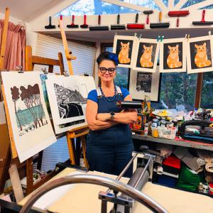 It is our pleasure to announce local artist Billy Nye, as one of our Guest Artists for the 2026 Art Show. Billy is well known for her hand painted linocuts that depict local scenes.